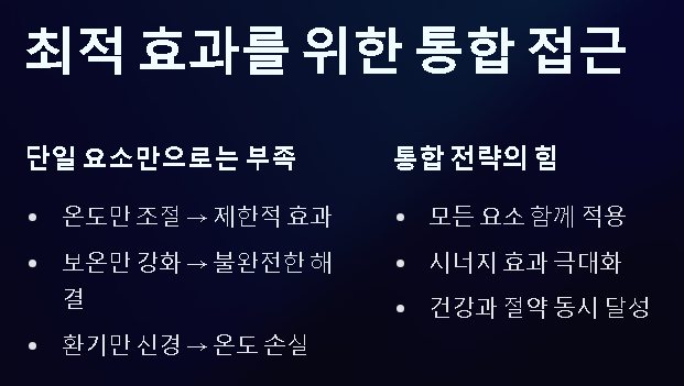 겨울철 난방 환경은 온도 하나만으로 결정되지 않습니다. 보온 아이템, 환기 루틴, 연령별 조절, 시간대별 운영 등을 모두 함께 적용해야 최적의 효과가 나타납니다. 이때 기준점이 되는 겨울철 실내 적정온도를 꾸준히 유지하면 건강과 난방비 절약이라는 두 가지 목표를 동시에 달성할 수 있습니다.